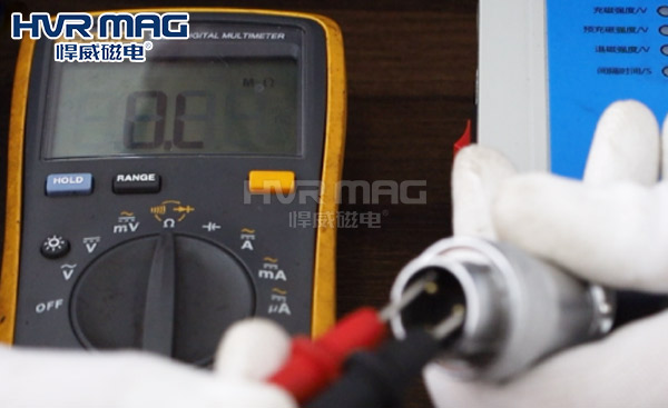 要想修復(fù)電永磁吸盤控制器顯示的E01故障,首先,需要準備一個萬用表,并將其打至電阻檔位,然后關(guān)閉控制器電源,檢查快速插頭是否安裝牢固(如不牢固則將其擰緊),然后將其擰出,測量磁鐵插口的1腳和2腳的電阻數(shù)值,若電阻數(shù)值顯示為無窮大,即說明磁鐵與控制器連接線路斷開,將線纜修復(fù)后,然后進行充磁或退磁操作,成功一次才會消除E01故障。若1腳和2腳的電阻數(shù)值與電永磁吸盤銘牌標識的電阻一致,則說明磁鐵與控制器的連接完好,此時需檢測電流檢測值是否正確,需要將磁鐵連接上控制器校準電流檢測閥值。