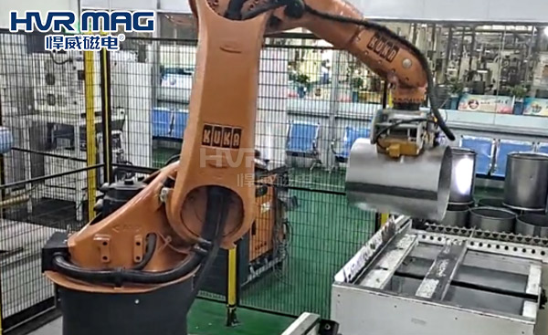 在自動化生產(chǎn)車間,工業(yè)機器人吸盤抓手是自動化搬運、碼垛的主要末端抓取設(shè)備,它決定著工業(yè)機器人能否將工件順利搬運至指定位置,且不對工件表面進行刮傷。機器人吸盤抓手的種類有很多種,如:氣動夾具、真空吸盤以及磁力吸盤等,今天悍威磁電小編給大家介紹的是由電永磁鐵構(gòu)成的機器人電永磁吸盤。