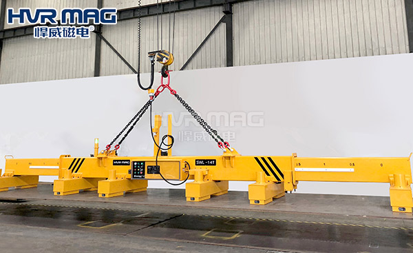 在面對鋼材多種工況時候電永磁吊具的其他功能就能發(fā)揮出最大的效果,比如在裝車時需要一次性吊裝多張,電永磁起重器就能實現(xiàn),磁力可分檔調節(jié),實現(xiàn)多張同時上料,單張下料的強大功能,或者是成排的方坯都可以一次性進行吊裝。