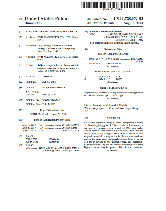 該發(fā)明專利名為:ELECTRIC PERMANENT MAGNET CHUCK,授權(quán)公告號為:US11,728,079B2;授權(quán)公告日為:2023年08月15日。
