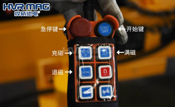 第五步,將遙控器【急停鍵】順時針旋開,按【開始鍵】啟動遙控器,按【充磁鍵】,等待2秒左右,狀態(tài)指示燈綠燈閃爍,電永磁吊具處于充磁狀態(tài),磁鐵吸附接觸的鋼板;