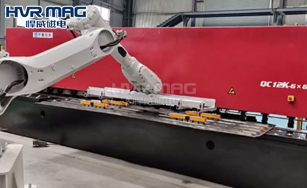 電永磁鐵作為工業(yè)生產(chǎn)中吸附工件的一大利器,除了可以作為電永磁起重器搬運鋼板、鋼管等工件之外,還可以將其安裝在工業(yè)機械手末端用來實現(xiàn)自動化搬運。今天電永磁吸盤廠家悍威磁電帶您走進車間,看下悍威機械手磁力吸盤吸附工件進行翻轉的車間實景案例。