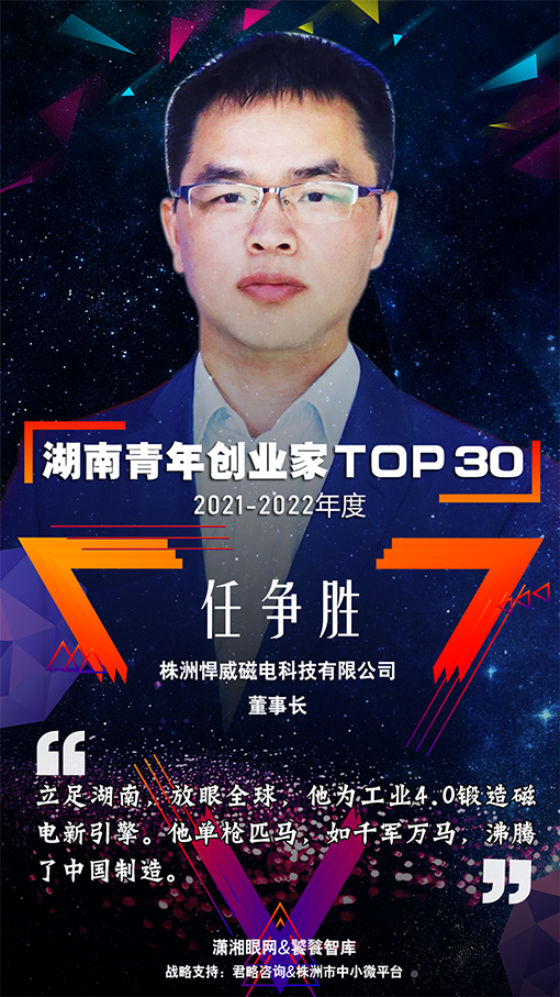 據(jù)悉,本次「湖南青年創(chuàng)業(yè)家」評(píng)選面向45歲及以下湖南籍或最近一年在湖南工作的創(chuàng)業(yè)者中開展。自今年3月組委會(huì)發(fā)起征集令以來,共收到100多份自薦或推薦申請(qǐng)表,專家組綜合候選人的影響力、創(chuàng)新力、社會(huì)責(zé)任、投資價(jià)值等六大指標(biāo)進(jìn)行評(píng)定,最終推選出了2021-2022年度湖南青年創(chuàng)業(yè)家TOP30名單,悍威磁電董事長(zhǎng)任爭(zhēng)勝先生便列于名單之上。