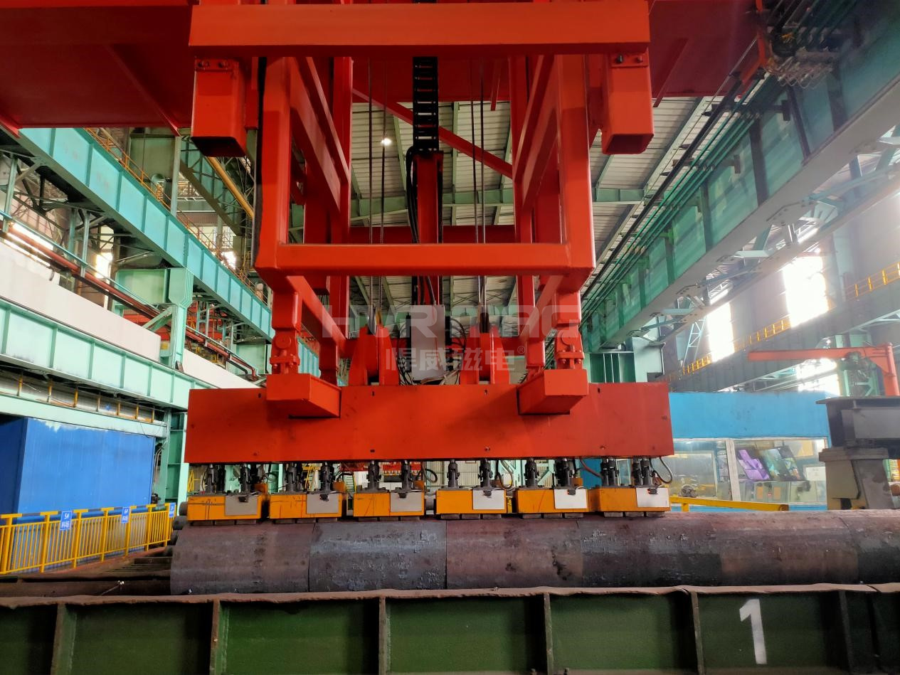 下圖所示的智能起重機(jī),配備了悍威磁電定制研發(fā)生產(chǎn)的6臺(tái)型號為HEPMSP-600P70S的電永磁鐵,通過配套的HEPC5-900A-T01電永磁控制器,實(shí)現(xiàn)單獨(dú)控制每臺(tái)磁鐵(PLC端輸出控制)。