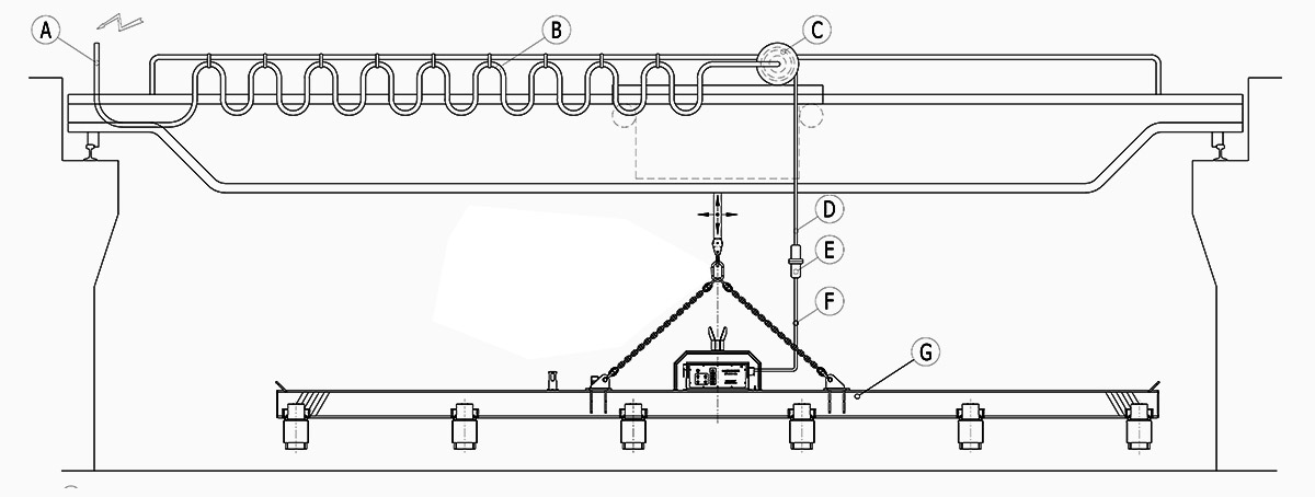 A:輸入電源 B:行車滑線 C:電纜卷筒 D:卷筒升降電纜 E:重載連接器 F:電永磁控制系統(tǒng)電源進(jìn)線 G:橫梁