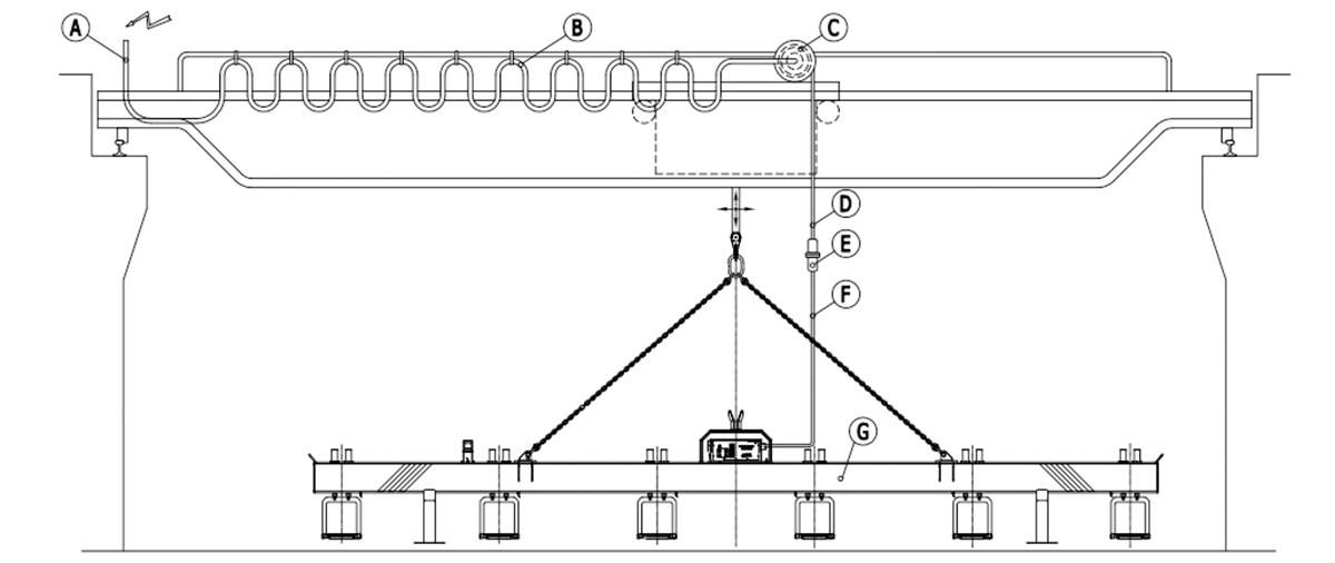 A:輸入電源 B:行車滑線 C:電纜卷筒 D:卷筒升降電纜 E:重載連接器 F:電永磁控制系統(tǒng)電源進(jìn)線 G:橫梁