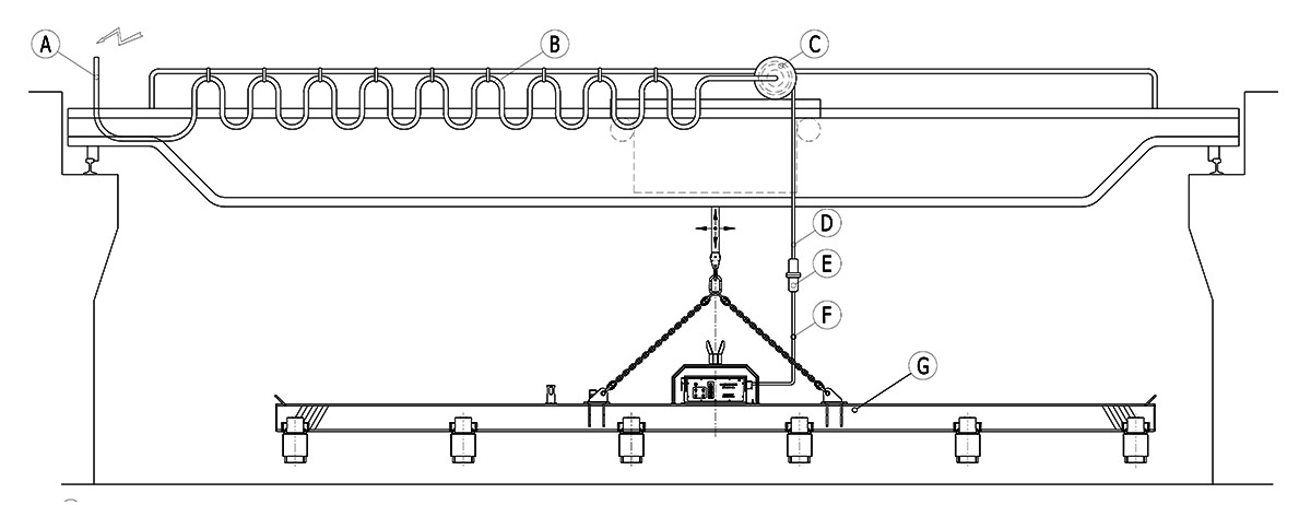 A:輸入電源 B:行車滑線 C:電纜卷筒 D:卷筒升降電纜 E:重載連接器 F:電永磁控制系統(tǒng)電源進(jìn)線 G:橫梁