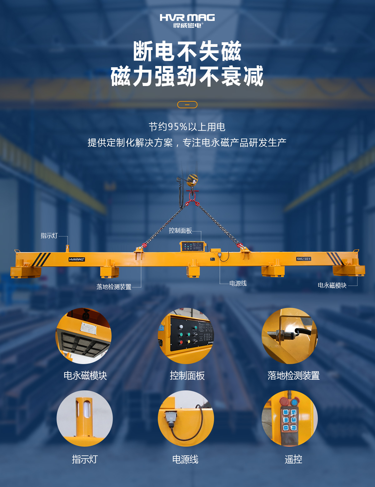 HM1鋼板磁力吊具系列的產(chǎn)品專為吊運(yùn)中厚板(厚度≥5mm的單張鋼板)設(shè)計(jì),HM1鋼板磁力吊具采用多臺(tái)電永磁鐵聯(lián)吊,具有多檔調(diào)磁功能,精準(zhǔn)控制吊具透磁深度,可確保完全不粘連下一張鋼板,極大提升鋼板吊運(yùn)效率,選擇不同起吊噸位的起重電永磁鐵,可分組控制適應(yīng)長度不同的鋼板吊具,大幅提高鋼板吊運(yùn)效率。