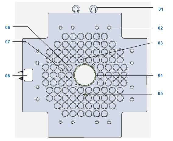 01吊環(huán)螺釘 02安裝螺釘孔 03模具錯動檢測 04定位環(huán) 05距離檢測 06磁通量檢測 07溫度檢測 08接線盒