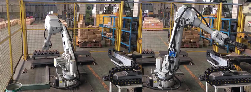 改善后:前后各用一臺工業(yè)機器人攜電永磁鐵自動化工作,實現(xiàn)無人操作,效率比原先提高50%,基本沒有維護成本。
