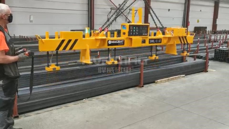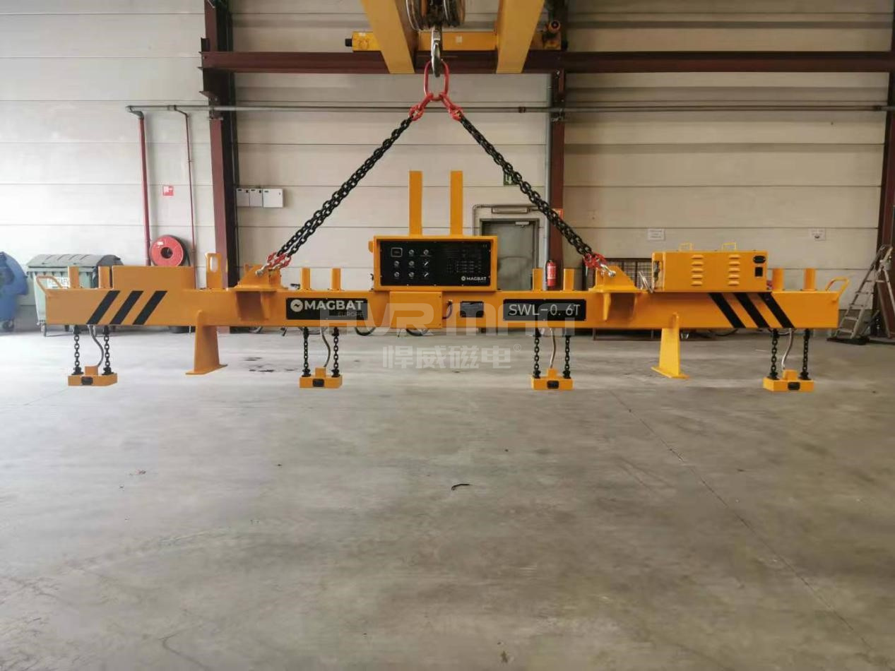 通常我們出貨的鋼板磁力吊具都是長磁極或者橫梁兩側(cè)對(duì)稱分布的磁鐵模塊的,用來吊運(yùn)常規(guī)尺寸寬度的板材。那窄鋼板該如何吊運(yùn)呢?別擔(dān)心,悍威也可定制如下圖這種充電式薄板磁力吊。