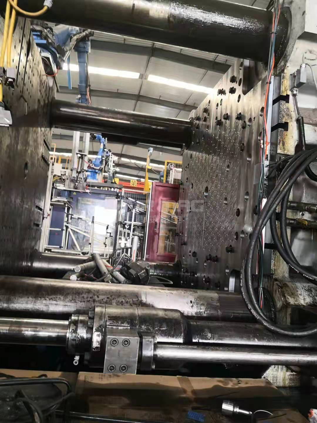 想知道大型注塑機(jī)是如何更換模具的么?是的,你沒看錯,下圖是國內(nèi)某注塑成型汽車配件廠家,安裝了磁力模板的2300噸注塑機(jī)快速換模現(xiàn)場。